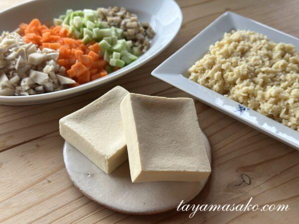 ・高野豆腐を戻し、そのままか、みじん切り(フードプロセッサーにかける)して、塩麴か醤油麹・甘酒をまぶし分解させます。(塩麴や醤油麹がなければそのままでもokですが分解はしない)
