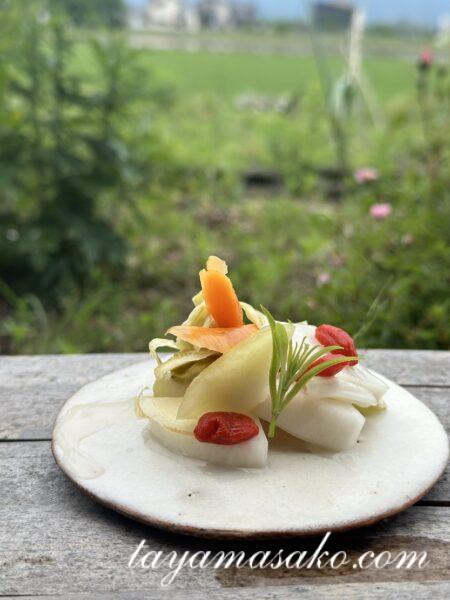 塩をして野菜の水分を出す目的もあります。野菜の重さに対して2~4%(私は2%でやっています)