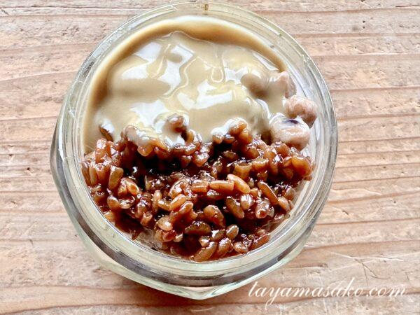 私のイメージですが納豆と醤油麹だけだと味の広がりがなくて、そこに練りごまが入ることで三種類の味がハーモニーとなり、軽やかな味わいになります。