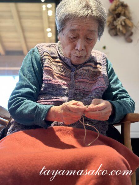 干し柿をつるす紐を結んだり、何本できた?と数を数えてもらったり