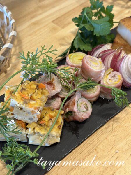 豚肉と野菜のくるくる巻き・厚揚げ醤油麹漬け・高野豆腐ふくさ焼き・とりテリーヌ・焼き野菜