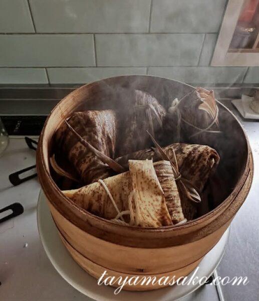 竹の皮も最小限で包めるように、オーブンペーパーで包んでから竹の皮で包む