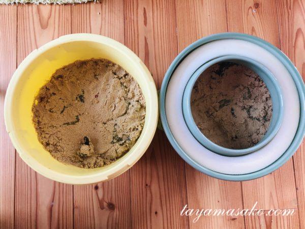 ポリ容器と紫香楽ラボさんの容器で、同じ条件でぬか床を始めました。