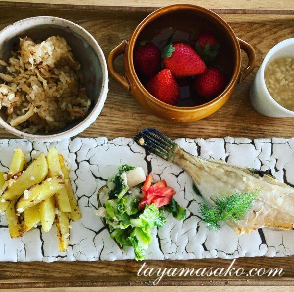 今の食事はメイン(魚かお肉)があって、煮豆・漬物・野菜・フルーツ・ご飯。