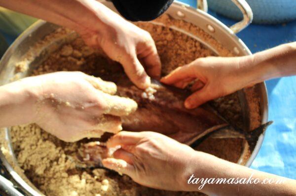 糠に魚醤を混ぜ、糠の硬さをみながら10尾を漬けます。