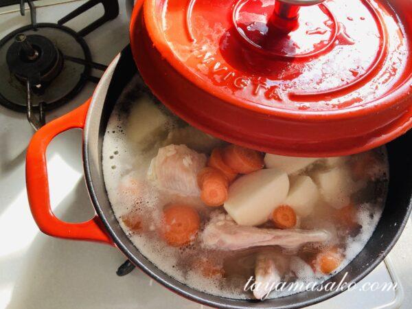 おかゆを炊く時、塩麹につけた手羽先、長芋、人参、白ネギ、さつまいもも入れて。