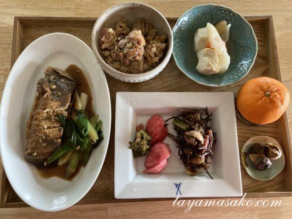 カレイの煮付け・ひじきの煮物・炊き込みごはん・里芋と厚揚げの煮物・お漬物・みかん・黒ニンニク。