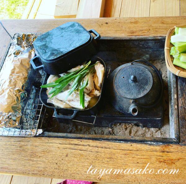 炭をおこし、火加減を調整しながら、炭を足したり。
