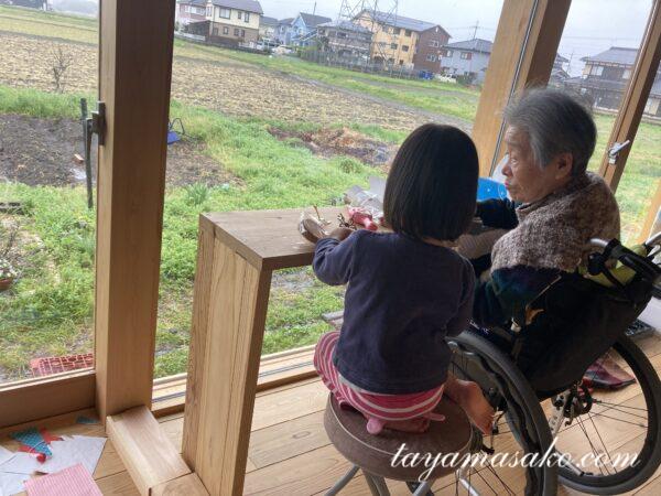たまに、2歳の可愛いお友達も遊びに来てくれます。一緒におやつ食べたり、折り紙したり。お世話される側から、お世話する側になる母にとって、良い刺激になるみたいです。