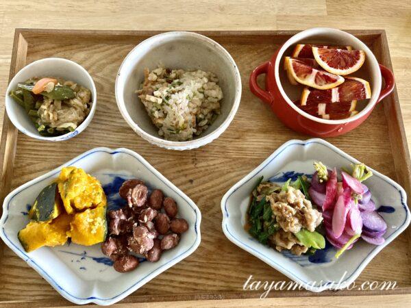 切り干し大根・金時豆・豚肉とニラの甘辛炒め・カボチャ・ぬか漬け・ホタルイカと野菜に炊き込みごはん・フルーツ。