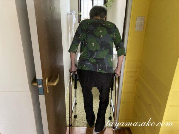 足の運びも安定してきたので、歩行器で洗面所に行き、立ったまま歯磨きをしてもらうことも。