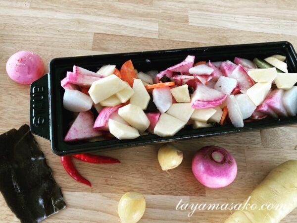 大量に漬けないのと厚めに野菜を切っていないので、水が上がるのも1~2日、麹を混ぜて3日ころから食べられます(通常1~2週間かかります)